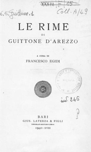| Keywords: Guittone - Rime, 1940 - 1851078 0001.jpg Book Guittone d'Arezzo Rime Laterza Bari ita it Le Rime / di Guittone d'Arezzo ; a cura di Francesco Egidi - Bari Laterza 1940 - 413 p ; 22 cm - Scrittori d'Italia ; 175 Frontespizio BEIC 1851078 Institution BEIC PD-old-100-1923 Poesia italiana - Sec 13 Literature of Italy |