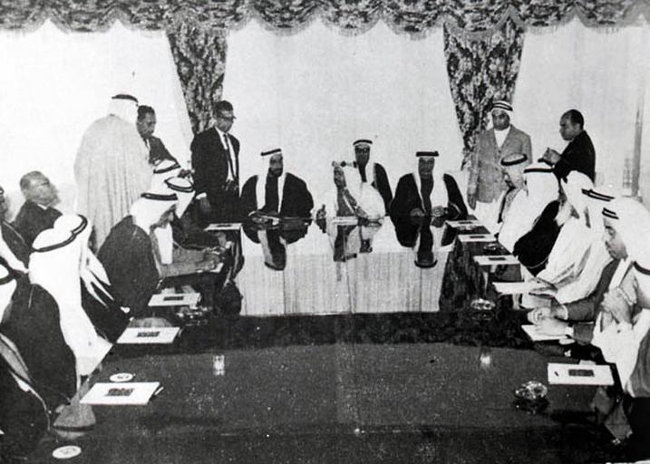 | Keywords: Gulf emirate leaders meet to discuss union plans 1968.jpg en The Bahraini emir Isa bin Salman Al Khalifa middle heads the opening session of the first conference on the formation of a union consisting of the emirates of the Persian Gulf in February 1968 Shaikh Zayed bin Sultan Al Nahyan is seen middle left ar صورة لسمو الأمير الراحل يرأس الجلسه الإفتتاحيه للمؤتمر الأول لحكام امارات الخليج في دبي 1968-02 http //www bna bh/portal/photos/637040/700944 Anonymous photographer other versions Custom license marker 2015 05 29 PD-Bahrain Uploaded with UploadWizard Uncategorized 2015 May 29 |