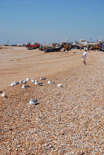 Keywords: gulls pebbles fishing boats boats ocean sea beach sky sand coast coastal marine coastline scenic outdoor nature environment seaside