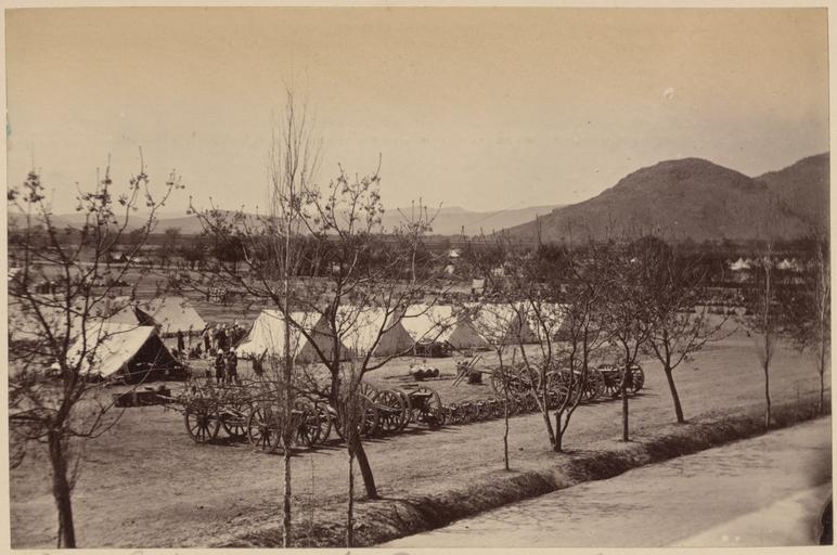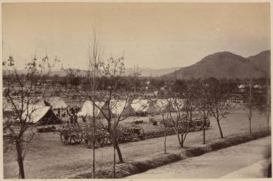 Keywords: Guns Captured at the Peiwar Kotal. Parked at Kohat WDL11488.png Artwork ru Бе к Джон уме в 1900 году fr Burke John mort en 1900 en Burke John died 1900 zh 约翰·伯克,卒于 1900 年 pt Burke John falecido em 1900 ar بيرك، جون، توفي 1900 es Burke John fallecido en 1900 ru О удия захваченные в Пейва ском ущелье и поставленные па ком в Кохате fr Canons saisis lors de la bataille de Peiwar Kotal alignés à Kohat en Guns Captured at the Peiwar Kotal Parked at Kohat zh 佩瓦科塔尔缴获并 放 胡 尔的火炮 pt Artilharia capturada em Peiwar Kotal Estacionada em Kohat ar مدافع أُستولي عليها في بيوار كوتَل وأُوقِفتْ في كوهات ru Эта фотог афия захваченных в Пейва ском ущелье афганских а тилле ийских о удий входит в альбом едких исто ических фотоснимков на кото ых изоб ажены люди и места связанные со Вто ой англо-афганской войной Пе едвижные полевые о удия азличных азме ов выст оены пе ед ядом б итанских палаток а пе еднем плане видна аллея де евьев ве оятно о ошаемых из идущего вдоль нее а ыка В конце нояб я 1878 года в Пейва ском ущелье состоялась битва между б итанскими войсками под командованием сэ а Ф еде ика Робе тса 1832 1914 гг и афганской а мией под п едводительством неизвестного военачальника в кото ой б итанцам благода я искусному манев у удалось добиться п еимущества В езультате б итанцы оде жали победу и захватили п оход че ез Пейва ское ущелье Вто ая англо-афганская война началась в нояб е 1878 года когда Великоб итания опасаясь как ей казалось астущего влияния России в Афганистане вто глась в эту ст ану с те ито ии Б итанской Индии Пе вый этап войны закончился в мае 1879 года подписанием Гандамакского догово а позволившего афганцам сох анить внут енний суве енитет однако заставившего их уступить конт оль над внешней политикой своей ст аны б итанцам Военные действия возобновились в сентяб е 1879 года после антиб итанского восстания в Кабуле и окончательно заве шились в сентяб е 1880 года ешающей битвой за Кандага Данный альбом включает по т еты б итанских и афганских лиде ов и военнослужащих фотог афии п остых афганских людей изоб ажения б итанских военных лаге ей военных действий ст оений пейзажей к упных и небольших го одов Все изоб аженные на фотоснимках места находятся на те ито ии сов еменных Афганистана или Пакистана в то в емя бывших частью Б итанской Индии Около т ети п едставленных в альбоме фотог афий выполнены Джоном Бе ком около 1843 1900 гг д угая т еть  сэ ом Бенджамином Симпсоном 1831 1923 гг а оставшаяся часть  несколькими д угими фотог афами Авто ы некото ых фотоснимков неизвестны Возможно что составителем альбома был один из членов б итанского п авительства в Индии однако это п едположение не подтве ждено Каким об азом альбом попал в Библиотеку Конг есса неизвестно <br>Афганские войны; Пушки; Великоб итания А мия; Военные лаге я; Солдаты; Палатки fr Ce cliché montrant les pièces d'artillerie afghanes capturées à Peiwar Kotal est extrait d'un album de photographies historiques rares de personnalités et de sites associés à la seconde guerre anglo-afghane Les canons de campagne mobiles et de différents calibres sont disposés devant un alignement de tentes britanniques Au premier plan la rangée d'arbres était probablement arrosée via le fossé d'irrigation qui la borde Peiwar Kotal fut le théâtre d'une bataille à la fin du mois de novembre 1878 lors de laquelle les forces britanniques de sir Frederick Roberts 1832 1914 déjouèrent l'armée afghane dirigée par un commandant non identifié Les Britanniques sortirent victorieux et s'emparèrent du col de Peiwar Kotal La seconde guerre anglo-afghane commença en novembre 1878 lorsque la Grande-Bretagne se sentant menacée par l'influence croissante des Russes en Afghanistan envahit le pays depuis l'Inde britannique La première phase de la guerre s'acheva en 1879 avec le traité de Gandamak qui permit aux Afghans de conserver leur souveraineté nationale mais les força à céder le contrôle de leur politique étrangère aux Britanniques Les combats reprirent en septembre 1879 à la suite d'un soulèvement antibritanniq