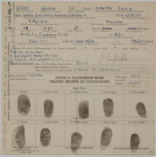Keywords: Günter Grass POW record.jpg The prisoner of war record of German author and Nobel Prize winner Günter Grass as of his capture as a Waffen-SS soldier at the end of World War II Downloaded from the http //www spiegel de/kultur/gesellschaft/0 1518 431823 00 html SPIEGEL Online article this image illustrated According to the article the record was stored at the Deutsche Dienststelle SPIEGEL Online tagged the photograph with the source information http //www marco-urban de marco-urban de Public domain as work of the U S government The mere photographic reproduction of the record is in and of itself ineligible for copyright under U S and German law see the German Wikipedia for details PD-USGov Günter Grass Deutsche Dienststelle 10th SS Panzer Division Frundsberg |