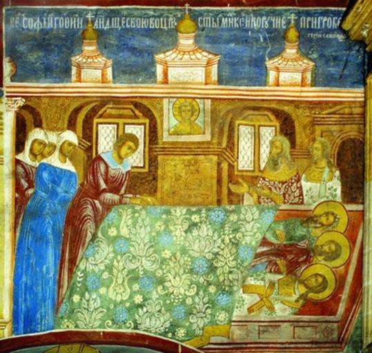 Keywords: Gury, Samon and Aviv 01.jpg ru Готский воин п иносит клятву пе ед мощами святых Гу ия Самона и Авива Ф агмент осписи п идела святых Гу ия Самона и авива ц п о Илии в Я ославле Посл четв XVII в XVIII c http //www pravenc ru/text/168390 html anonimus PD-Art Gurias Samonas and Abibus