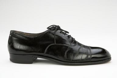 | Keywords: Gustav VI Adolfs lacksko - Livrustkammaren - 6913.tif En svart sko av lackat kalvskinn med sluten öppning oxfordmodell Skon är skuren i ovanläder och bakkappa som förenas i en söm som löper från den ena sidan till den andra över fotens framdel Längst ut på ovanlädret en mycket blank rak tåhätta Bakkappan har en söm mitt bak <br/>Skon har 5 par snörhål och snörs ihop med ett svart skosnöre över en plös Skon är randsydd <br/>Ovanlädret fodrat med beige linne Plösen och bakkappan fodrade med färgat grått kalvskinn <br/>Innersula av brunt nötläder som baktill har förstärkt med en gråfärgad halvsula märkt med CHURCH´s // Famous English // Shoes // MANUFACTURED BY // Palers Ltd // JERSEY // 299 OXFORD ST WI <br/>Svart målad lädersula med förstärkning framtill under tåpartiet I hålfoten märkt<br/> CHURCH // H // D // 5 <br/>Klack av läder och gummi fäst med 8 st pliggar original caption Gustav VI Adolfs lacksko LRK 14349 <br/> Nyckelord Sko Svart Gustav VI Adolf Lack Herrmode Föremålsbild 1955 linen Färg beige material linne size mm 295 size mm 103 sula size mm 25 klack size mm 70 klack g 400 LRK Skor ger mer - makt flärd magi 2007 place of origin original filename lm_dig2315_14349 50851 inventory number LRK 14349 6913 CC-BY-SA Göran Schmidt Göran Schmidt Footwear in Livrustkammaren Black shoes Fashion Male clothing Shoes on white background Media contributed by LSH unmatched material Media contributed by LSH dim-with multiple size templates Media contributed by LSH unmatched keyword Media contributed by LSH 2013-10 |