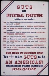 Keywords: Guts or intestinal fortitude. Our boys in uniform can^ Yes - it takes guts to be an American^ Remember Pearl Harbor. - NARA - 535231.jpg Scope and content General notes 535231 Local identifier 179-WP-1381 Office for Emergency Management War Production Board 01/1942 - 11/03/1945 Still Picture Records Section Special Media Archives Services Division NWCS-S National Archives at College Park 8601 Adelphi Road College Park MD 20740-6001 other date circa 1942 1943 Record group Record Group 179 Records of the War Production Board 1918 - 1947 Record group ARC 508 War Production Board compiled 1942 - 1943 Series ARC 533858 File unit File unit ARC Variant control numbers NAIL Control Number NWDNS-179-WP-1381 Other versions <gallery> File Guts_or_intestinal_fortitude _Our_boys_in_uniform_can _Yes_-_it_takes_guts_to_be_an_American _Remember_Pearl_Harbor _-_NARA_-_535231 tif tif File Guts_or_intestinal_fortitude _Our_boys_in_uniform_can _Yes_-_it_takes_guts_to_be_an_American _Remember_Pearl_Harbor _-_NARA_-_535231 jpg jpg </gallery> NARA-cooperation PD-USGov World War II posters from the United States