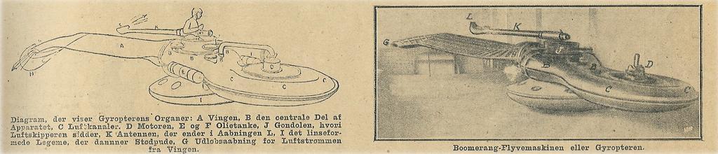 | Keywords: Gyrocopter by Papin and Rouilly 1914.jpg Plan of Gyropter invented by Papin and Rouilly from France from Danish magazine Illustreret Familiejournal Illustrated Familyjournal 1914 no 44 p 29 The caption reads Diagram showing the parts of the gyropter A The wing B The central part of the machine C Airchannels D The motor E F The oiltank J The gondola wherein the aircaptain sits K The antenna that ends in the opening L I the lenseshaped body that creates a cushion G Emitteropening for the airstream from the wing The caption on the second picture reads The boomerang flying machine or the gyropter Illustreret Familiejournal 1914 Users reproduction of an expired work of art PD-Art Monocopter 1910s diagrams Inventions Hovercraft in art |
