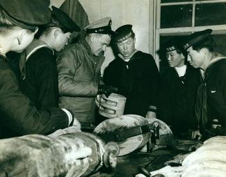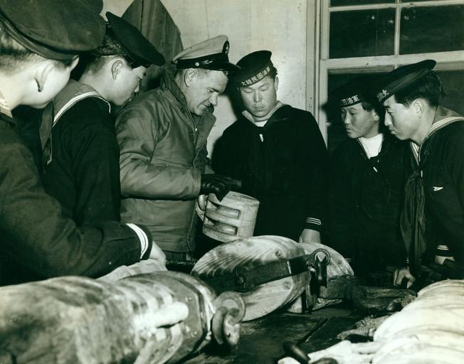 Keywords: NH 97150. "Republic of Korea Navy Service Schools". "Chief Boatswain's mate Joe E. Brewer, USN, ... shows these interested looking ROK sailors the workings of block and tackle -- all part of seamanship." "Chief Brewer is the Advisor at the Boatswain's mate school." Photograph and caption were released by Commander Naval Forces, Far East, under date of 27 February 1952. The sailors' cap ribbons read (in translation): "Republic of Korea Navy". The two bands in right-center read from left to right. That at far right reads from right to left. Official U.S. Navy Photograph, from the "All Hands" collection at the Naval History and Heritage Command. NH 97150. "Republic of Korea Navy Service Schools". "Chief Boatswain's mate Joe E. Brewer, USN, ... shows these interested looking ROK sailors the workings of block and tackle -- all part of seamanship." "Chief Brewer is the Advisor at the Boatswain's mate school." Photograph and caption were released by Commander Naval Forces, Far East, under date of 27 February 1952. The sailors' cap ribbons read (in translation): "Republic of Korea Navy". The two bands in right-center read from left to right. That at far right reads from right to left. Official U.S. Navy Photograph, from the "All Hands" collection at the Naval History and Heritage Command. |