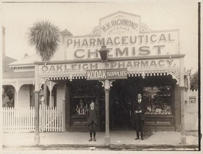 | Keywords: oakleigh chemist retail h.h.richmond pharmaceutical chemist hhrichmondpharmaceuticalchemist shops text writing Black and white silver gelatin photograph of H.H.Richmond Pharmaceutical Chemist, Oakleigh, circa 1910s. There is a hand painted sign hung in the centre of the awning reading 'Kodak Supplies'. Kodak manufactured and distributed a wide range of photographic products to Australasia, such as film, paper, chemicals, cameras and miscellaneous equipment. Its client base included amateur and professional photographers, as well as specialist medical and graphic art professionals who used photography, x-ray and other imaging techniques. This photograph is part of the Kodak collection of products, promotional materials, photographs and working life artefacts collected from Kodak Australasia in 2005, when the Melbourne manufacturing plant at Coburg closed down. Part of the Kodak Heritage Collection Source: Museums Victoria collections.museumvictoria.com.au/items/1483926 Black and white silver gelatin photograph of H.H.Richmond Pharmaceutical Chemist, Oakleigh, circa 1910s. There is a hand painted sign hung in the centre of the awning reading 'Kodak Supplies'. Kodak manufactured and distributed a wide range of photographic products to Australasia, such as film, paper, chemicals, cameras and miscellaneous equipment. Its client base included amateur and professional photographers, as well as specialist medical and graphic art professionals who used photography, x-ray and other imaging techniques. This photograph is part of the Kodak collection of products, promotional materials, photographs and working life artefacts collected from Kodak Australasia in 2005, when the Melbourne manufacturing plant at Coburg closed down. Part of the Kodak Heritage Collection Source: Museums Victoria collections.museumvictoria.com.au/items/1483926 |
