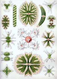 Keywords: Haeckel Desmidiea.jpg Enlarge image for index to numbers Staurastrum furcatum <small> Brébisson </small> Staurastrum furcatum <small> Brébisson ex Ralfs Brébisson</small> single cell from above Staurastrum vestitum <small> Brébisson </small> Staurastrum vestitum <small>Ralfs</small> mating Staurastrum aculeatum <small> Ehrenberg </small> Staurastrum aculeatum <small>Meneghini ex Ralfs</small> 3a mating from the side 3b single cell from above Staurastrum paradoxum <small> Meyen </small> Staurastrum paradoxum <small>Meyen ex Ralfs</small> 4a mating from the side 4b mating from above Staurastrum spinosum <small> Brébisson </small> Staurastrum furcatum <small> Brébisson ex Ralfs Brébisson</small> spore immediately after mating Micrasterias denticulata <small> Brébisson </small> Micrasterias denticulata <small>Brébisson ex Ralfs</small> dividing cell from above Micrasterias trigemina <small> Haeckel </small> Micrasterias trigemina <small>E H P A Haeckel</small> dividing cell from above Micrasterias melitensis <small> Ehrenberg </small> Micrasterias melitensis <small>G G A Meneghini</small> / Micrasterias furcata <small>C Agardh ex Ralfs</small> single cell from above Spirotaenia condensata <small> Brébisson </small> Spirotaenia condensata <small>Brébisson ex Ralfs</small> single cell from the side Closterium costatum <small> Corda </small> Closterium costatum <small>Corda ex Ralfs</small> single cell from above Euastrum pecten <small> Ehrenberg </small> Euastrum pecten <small>C G Ehrenberg</small> single cell from above Euastrum agalma <small> Haeckel </small> Euastrum agalma <small>E H P A Haeckel</small> single cell from above Euastrum apiculatum <small> Ehrenberg </small> Micrasterias apiculata <small>Meneghini ex Ralfs</small> single cell from above Kunstformen der Natur 1904 plate 24 Desmidiea see http //caliban mpiz-koeln mpg de/haeckel/kunstformen/high/Tafel_024_300 html here http //caliban mpiz-koeln mpg de/haeckel/kunstformen/high/Tafel_024_text_1_200 html here and http //caliban mpiz-koeln mpg de/haeckel/kunstformen/high/Tafel_024_text_2_200 html here creator Ernst Haeckel 1904 public domain due to age PD-old Kunstformen der Natur 1904 Desmidiaceae Closterium Mesotaeniaceae Chloroplasts Staurastrum Micrasterias Spirotaenia Euastrum |