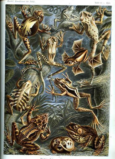 | Keywords: Haeckel frogs with labels.jpg in German <gallery> Image Haeckel frogs text jpg </gallery> English translation Remarks made by the translator are in italics or square brackets<br/> Fig 1 The pouch frog of Venezuela is remarkable for its female's possession of a paired dorsal <nowiki>back</nowiki> pouch in which the eggs remain until the hatching of the tadpoles A narrow triangular gap at the rear of the back in the centre of the lightly coloured saddle patch leads to the pouch <br/> Fig 2 Mediterranean Tree Frog Stripeless Tree Frog<br/> The treefrog of North Africa and Southern Europe is little different from our native common green treefrog Hyla arborea and like the latter lives on trees and shrubs When crying <nowiki>calling</nowiki> the male pushes forward the vocal sac like a bubble <br /> Fig 3 The treefrog of Ecuador is characterised by the crude build of its thick fingers with very wide contact plates and the knobbly skin that like in toads is covered in glandular warts <br /> Fig 4 The climbing frog of Ecuador is among the slimmest and most supple forms of treefrogs; his extraordinarily thin and long limbs with zebralike dark stripes across enable it of the most dexterous climbing arts <br /> Fig 5 The flying frog of Borneo is remarkable above all other Batrachids for its extraordinarily widened foot webbings between the elongated toes If the flying frog spreads these webs while jumping from tree to tree he can use them as a parachute similar to the flying dragon Draconellus among the reptiles Plate 79 and the flying squirrels Pteromys among the rodents <br /> Fig 6 The military frog of Surinam is very peculiar in that the female carries its young on its back in military rank The little tadpoles numbering 12 to 20 attach to two diverging back ridges of the mother that run symmetrically either side of the dorsal central line by their oral suction plates The mobile rudder tails are turned outward on the left side as on the right <br /> Fig 7 The banded frog of Java has two parallel white bands on its back running lengthwise that contrast strongly against the dark red brown base colour The jumping treefrog is about to capture an insect with its protruded bicornuated tongue <br /> Fig 8 The tip frog from the Solomon Islands is assigned to the group of horn frogs that are distinguished by a pair of sharp horns on top of the triangular head; these are elongated coverings of the upper eye lids The bright colouration and patterning of this horn frog is most variable and often adapted to its environment <br /> Fig 9 The thickhead frog from East Africa Mozambique Sambesi deviates from all other frogs in the appearance of its very short and thick head Furthermore it cannot jump with its short and weak legs and moves its fat crude body only with difficulty The hind feet have large spade-like digging swellings that help it to rapidly dig itself into the soil It feeds on termites and in its subterranean habits is equal to the moles <br /> Fig 10 Northern Leopard Frog<br /> The piping frog of North America Right behind the eye one can see the large white entirely superficially positioned eardrum Kunstformen der Natur 1904 plate 68 Batrachia see http //caliban mpiz-koeln mpg de/haeckel/kunstformen/high/Tafel_068_300 html here http //caliban mpiz-koeln mpg de/haeckel/kunstformen/high/Tafel_068_text_1_200 html here and http //caliban mpiz-koeln mpg de/haeckel/kunstformen/high/Tafel_068_text_2_200 html here Ernst Haeckel 1904 public domain due to age <gallery>File Haeckel Batrachia jpg</gallery> Haeckel Batrachia L lineatus jpg Hylarana erythraea Haeckel png PD-old Kunstformen der Natur 1904 Neobatrachia Gastrotheca ovifera Hyla meridionalis Ecnomiohyla tuberculosa Gastrotheca guentheri Rhacophorus pardalis Leptodactylus lineatus Hylarana erythraea Ceratobatrachus guentheri Breviceps mossambicus Lithobates pipiens |