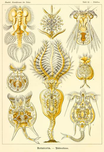 | Keywords: Haeckel Rotatoria.jpg top left Pedalion mirum <small> Hudson </small> Hexarthra mira <small> Hudson 1871 </small> from above top center Lacinularia socialis <small> Ehrenberg </small> Lacinularia flosculosa <small> O F Muller 1773 </small> group of individuals on water plant top right Polyarthra platyptera <small> Ehrenberg </small> Polyarthra sp from above left Pterodina patina <small> Ehrenberg </small> Testudinella patina <small> Hermann 1783 </small> from above center Stephanoceros Eichhornii <small> Ehrenberg </small> Stephanoceros fimbriatus <small> Goldfuss 1820 </small> from the side right Euchlanis dilatata <small> Leydig </small> Euchlanis dilatata <small>Ehrenberg 1832</small> from above bottom left Noteus Leydigii <small> Haeckel </small> Platyias quadricornis <small> Ehrenberg 1832 </small> from above bottom right Brachionus Bakeri <small> Ehrenberg </small> Brachionus quadridentatus <small>Hermann 1783</small> / Brachionus capsuliflorus <small>Pallas 1766</small> from above Kunstformen der Natur 1904 plate 32 Rotatoria see http //caliban mpiz-koeln mpg de/haeckel/kunstformen/high/Tafel_032_300 html here http //caliban mpiz-koeln mpg de/haeckel/kunstformen/high/Tafel_032_text_1_200 html here and http //caliban mpiz-koeln mpg de/haeckel/kunstformen/high/Tafel_032_text_2_200 html here creator Ernst Haeckel 1904 public domain due to age PD-old Kunstformen der Natur 1904 Hexarthra mira Lacinularia flosculosa Polyarthra Testudinella patina Stephanoceros fimbriatus Euchlanis dilatata Platyias quadricornis Brachionus rotifera |