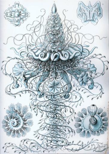 Keywords: Haeckel Siphonophorae 37.jpg center Discolabe quadrigata <small> Haeckel </small> Physophora hydrostatica <small>Forskål 1775</small> colony top left Discolabe quadrigata <small> Haeckel </small> Physophora hydrostatica <small>Forskål 1775</small> gas bladder and bells from above top right Discolabe quadrigata <small> Haeckel </small> Physophora hydrostatica <small>Forskål 1775</small> single swimming bell from above bottom left Discolabe quadrigata <small> Haeckel </small> Physophora hydrostatica <small>Forskål 1775</small> trunk without polyps from below bottom right Discolabe quadrigata <small> Haeckel </small> Physophora hydrostatica <small>Forskål 1775</small> trunk without polyps from above Kunstformen der Natur 1904 plate 37 Siphonophorae see http //caliban mpiz-koeln mpg de/haeckel/kunstformen/high/Tafel_037_300 html here http //caliban mpiz-koeln mpg de/haeckel/kunstformen/high/Tafel_037_text_1_200 html here and http //caliban mpiz-koeln mpg de/haeckel/kunstformen/high/Tafel_037_text_2_200 html here creator Ernst Haeckel 1904 public domain due to age PD-old Kunstformen der Natur 1904 Physophora hydrostatica |