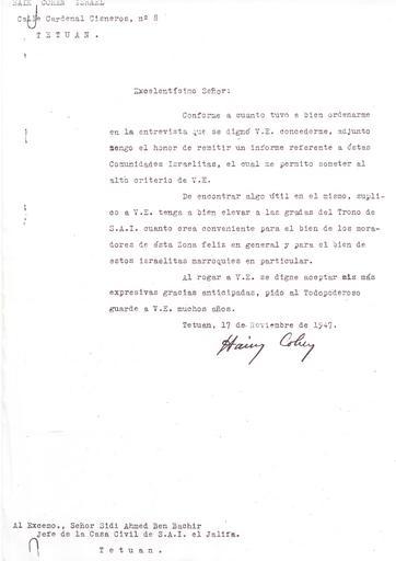 | Keywords: Haim.jpg en Haim the head of the Jewish community writing to Belbachir own Shaskouri 1947-11-17 n/a This document is family owned It is coming from the archives of Belbachir The recipient is my father History of Morocco Historic Jewish communities Judaism in Morocco 1947 |