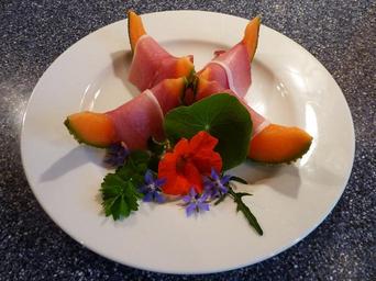 Keywords: ham melon muskmelon cantaloupe nasturtium ruccula pimpernel borage blossoms starter herbs edible herbs