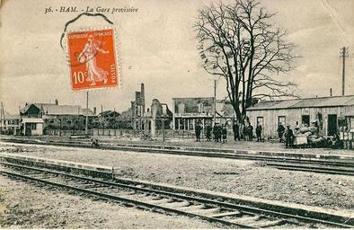 | Keywords: 49 44N 3 04E Ham station, 1920, is a railway station located in the commune of Muille-Villette near Ham in the Somme department, France. Ham was in the combat area during the Battle of the Somme in World War I and suffered heavy damages. The station was destroyed, and a provisional station was built. Opened 1867. |