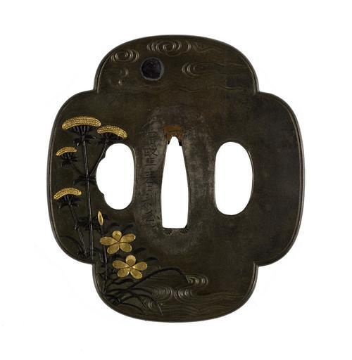 Keywords: Hamano Harutoshi - Tsuba with Autumn Flowers - Walters 51127 - Back.jpg This tsuba shows the moon with seasonal flowers Beneath a full moon on the front are golden lace ominaeshi and bush clover hagi On the back pampas grass susuki and dianthus nadeshiko are depicted beneath a crescent moon Golden lace and bush clover are both indicative of autumn Pampas grass is also a sign of autumn while dianthus is a summer flower With this combination of flowers and a crescent rather than full moon the back of the tsuba seems to be invoking the seasonal change from summer to autumn ca 1850 late Edo silver alloy with silver gold-copper gold and silver-gold cm 7 2 accession number 51 127 39526 Henry Walters Baltimore date and mode of acquisition unknown Walters Art Museum Henry Walters Acquired by Henry Walters Signature Hamano Harutoshi kao place of origin Edo present-day Toyko Japan Walters Art Museum license Tsuba in the Walters Art Museum Hamano Harutoshi Media contributed by the Walters Art Museum needs category review |