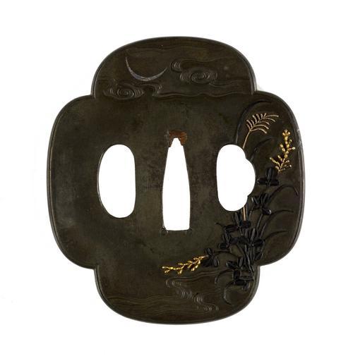 Keywords: Hamano Harutoshi - Tsuba with Autumn Flowers - Walters 51127.jpg This tsuba shows the moon with seasonal flowers Beneath a full moon on the front are golden lace ominaeshi and bush clover hagi On the back pampas grass susuki and dianthus nadeshiko are depicted beneath a crescent moon Golden lace and bush clover are both indicative of autumn Pampas grass is also a sign of autumn while dianthus is a summer flower With this combination of flowers and a crescent rather than full moon the back of the tsuba seems to be invoking the seasonal change from summer to autumn ca 1850 late Edo silver alloy with silver gold-copper gold and silver-gold cm 7 2 accession number 51 127 39526 Henry Walters Baltimore date and mode of acquisition unknown Walters Art Museum Henry Walters Acquired by Henry Walters Signature Hamano Harutoshi kao place of origin Edo present-day Toyko Japan Walters Art Museum license Tsuba in the Walters Art Museum Hamano Harutoshi Media contributed by the Walters Art Museum needs category review |
