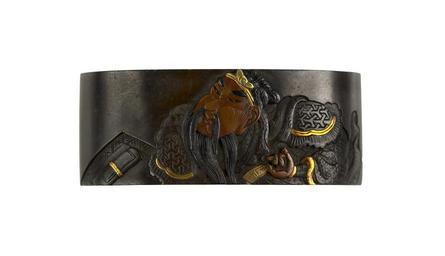 Keywords: Hamano Naohide - Fuchi with the Chinese General Kanyu - Walters 511068.jpg This is the 2nd-century Chinese general Kanyu Ch Guan Yu Kuan Yu Stories of his activities during the Three Kingdoms period are told in the 14th-century novel Romance of the Three Kingdoms He is recognizable by his long black beard A scroll is on the desk before him and his halberd is on the reverse This is part of a set with Walters 51 1069 1st half Other date century 19 late Edo shibuichi nigurome copper gold cm 3 7 l accession number 51 1068 29916 William T / Henry Walters Collection Baltimore date and mode of acquisition unknown Walters Art Museum Henry Walters Acquired by William T or Henry Walters Signature Hamano Naohide kakihan ; Number In pencil 826 6 place of origin Takata Japan Walters Art Museum license Fuchi in the Walters Art Museum Hamano Naohide Media contributed by the Walters Art Museum needs category review Guan Yu |