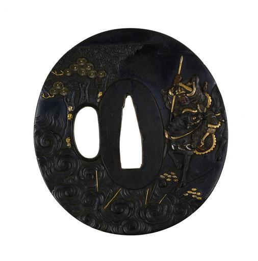 Keywords: Hamano Naoyuki - Tsuba with a Kuanyu Preparing to Throw a Spear - Walters 51208.jpg The mounted figure along the right edge of this tsuba is 2nd century Chinese general Kanyu Ch Guan Yu Kuan Yu Stories of his activities during the Three Kingdoms period are told in the 14th century novel Romance of the Three Kingdoms Kuanyu is about to plunge his spear into the water Waves fill the lower section of both sides of the tsuba On the reverse the spears and battle flag of a army appear above the waves between 1773 1829 late Edo shakudo details in gold cm 7 2 6 7 0 35 accession number 51 208 11048 Henry Walters Baltimore date and mode of acquisition unknown Walters Art Museum Henry Walters Acquired by Henry Walters Signature Hamano Naoyuki place of origin Edo present-day Tokyo Japan Walters Art Museum license Tsuba in the Walters Art Museum Hamano Naoyuki Media contributed by the Walters Art Museum needs category review Guan Yu |