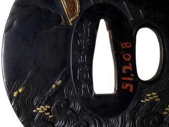 Keywords: Hamano Naoyuki - Tsuba with a Kuanyu Preparing to Throw a Spear - Walters 51208 - Mark.jpg The mounted figure along the right edge of this tsuba is 2nd century Chinese general Kanyu Ch Guan Yu Kuan Yu Stories of his activities during the Three Kingdoms period are told in the 14th century novel Romance of the Three Kingdoms Kuanyu is about to plunge his spear into the water Waves fill the lower section of both sides of the tsuba On the reverse the spears and battle flag of a army appear above the waves between 1773 1829 late Edo shakudo details in gold cm 7 2 6 7 0 35 accession number 51 208 11048 Henry Walters Baltimore date and mode of acquisition unknown Walters Art Museum Henry Walters Acquired by Henry Walters Signature Hamano Naoyuki place of origin Edo present-day Tokyo Japan Walters Art Museum license Tsuba in the Walters Art Museum Hamano Naoyuki Media contributed by the Walters Art Museum needs category review |