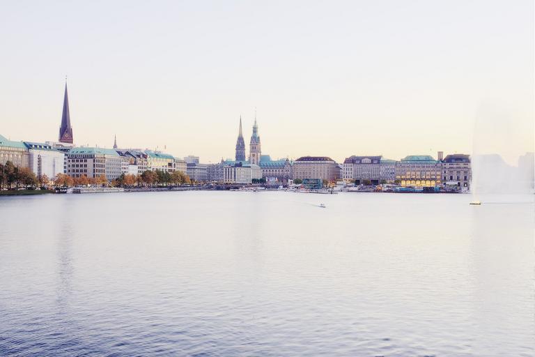 Keywords: hamburg alster water innenalster germany sunset abendstimmung high key city view pastel views sky
