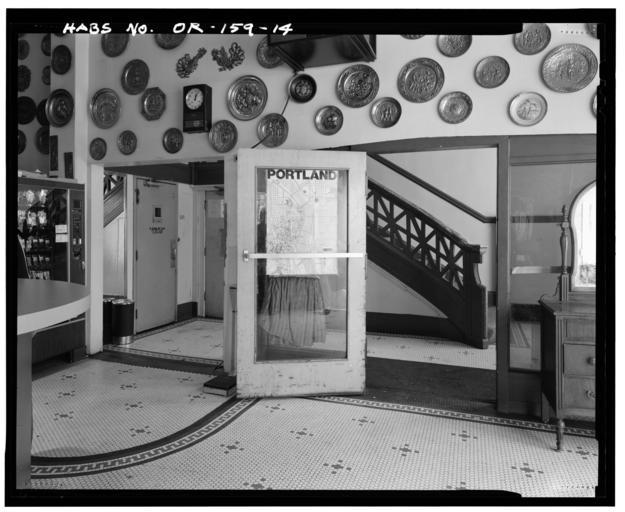 | Keywords: Hamilton Hotel - lobby to vestibule - Portland Oregon.jpg OR-159-14 View from lobby looking south into vestibule 90mm Photo by John Stamets HABS PD-USGov-Interior-HABS Library of Congress 1993-03 Historic American Buildings Survey HABS PD-USGov Hamilton Hotel Building interiors in Oregon 1993 in Oregon Black and white photographs of Oregon |
