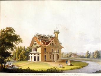 | Keywords: Hammer CG (C16)Sommerhaus.jpg  Bild-Beschreibung / description of picture 10 top right style background 87CEFF Titel / Title Sommerhaus des Fürsten Putjatin - valign top right style background 87CEFF Beschreibung / Description Blick auf das Sommerhaus; Land Werk und Eigentum der Fürstin und des Fürsten Putjatin <br/> Nachdem Nikolai Abramowitsch Fürst Putjatin wegen seiner Liebesaffäre mit der verheirateten Gräfin Elisabeth von Sievers den Hof der Zarin Katharina II in Petersburg verlassen musste erwarb er am 21 Dezember 1797 das damalige Petzold ™sche Bauerngut in der südöstlich von Dresden gelegenen Kleinzschachwitzer Dorfflur die seinerzeit unter der Gerichtsbarkeit des Rittergutes Lodwitz stand und siedelte sich dort mit seiner Gräfin und deren zweiter Tochter Elisabeth Benedicta die an einer Lungenkrankheit litt an <br/> Der Fürst entwarf und baute auf dem erworbenen Gelände dem noch einige Wald- und Feldstücke zugefügt wurden seine žKate wie er das Sommerhaus zu nennen pflegte das vollkommen auf die Genesung der Stieftochter ausgerichtet war In alle Richtungen der Windrose waren Balkone angebracht sechszehn Stück insgesamt weiträumige Dachterrassen und ein Turm zur Wetterbeobachtung in der Form eines Minaretts waren weithin sichtbare Elemente des von einem mehrfach überbrückten Bach umflossenen Hauses Innerhalb der Villa gab es einen runden Speisesaal mit einem eisernen Ofen in Form einer Palme sowie zwei Salons von denen der größere von einer gläsernen Orangerie mit Springbrunnen umschlossen wurde Die Wohnräume in den oberen Etagen durch liftartige Maschinen erreichbar waren sehr bequem der Raum der Tochter grenzte unmittelbar an einen Kuhstall weil man meinte dass die Stalldüfte für die Heilung der Lunge dienlich seien Im Garten gab es zunächst einen labyrinthischen durch Seitenfenster erhellten und mit Rasen ausgekleideten Gang für angenehm kühle Spaziergänge weiterhin viele künstliche Ruinen Tempel und Grotten schattige Sitzgelegenheiten Vexierspiegel und Wasserspiele außerdem Schöpfräder am Bach zur Bewässerung der vielen Rasen- und Pflanzenrabatten sowie als besonderes Hobby des Fürsten eine für 30 Personen ausgelegte Schaukel Für sich selbst hatte er sogar eine Art Seilbahn konstruiert mit der er in rasender Fahrt von einem Seitenfenster der oberen Etage zum Fuße eines Baumes inmitten des Gartens gelangen konnte Der Park war für das allgemeine Publikum geöffnet und seinerzeit weithin bekannt weshalb der Hammersche Kupferstich auch in ein vom Dresdener Kunsthändler Heinrich Rittner herausgegebenes Magazin aufgenommen wurde <br/> Heute existiert noch ein http //www putjatinhaus de Putjatinhaus in Dresden-Kleinzschachwitz <br/> alt-aquarellierter Umrissstich<br/><br/> View of the summer house; Country work and property of the princess and the prince Putjatin <br/> After Nikolai Abramowitsch prince Putjatin had to leave the yard of the Katharina II in Petersburg because of its affair with married countess Elizabeth von Sievers he acquired at the 21 Dezember 1797 the Petzold-Farm in the village Kleinzschachwitz lain southeast from Dresden which stood at that time under the jurisdiction of the manor Lodwitz He settled themselves there with its countess and their second daughter Elizabeth Benedicta which suffered from a lung illness <br/> The prince designed and built on the acquired area to which still some forest and pieces of field were added his žCottage as he tended to call the summer house which was to set perfectly for the healing of the stepdaughter Into all directions of the compass rose balconies were attached sixteen pieces altogether spacious roof terraces and a tower for to watch the Weather situation in the form of a Minarett were far away visible elements of the house flowed around by a several times bridged brook Within the mansion there was a round dining room with an iron furnace in form of one palm as well as two salons by which the larger of a glassy orangeriy was enclosed with jumping wells The dwellings in the upper floors by elevator-like machines attainable were very comfortable the area of the daughter bordered directly on a cow stable because one meant that the stable smells for the healing of the lung were helpful In the garden there was first a labyrinth-like corridor by side windows illuminated and with lawns lined course for pleasantly cool walks further many artificial ruins temples and grottos shady seat opportunities mirrors of distortion and watergames in addition persian weels at the brook to the irrigation of the many racing and plant discounts as well as special hobby of the prince a swing laid out for 30 persons For itself it had designed even a kind aerial ropeway with which it could arrive in racing travel of a side window of the upper floor at the foot of a tree in the middle of the garden The park was for the general public opened and at that time far away well-known why the etching by Hammer was taken up also to a magazine published by the dealer of art Heinrich Rittner from Dresden <br/> outline etching in old original color top right style background 87CEFF Autor / Artist gezeichnet und gestochen / painting and etching Christian Gottlob Hammer 1779-1864 top right style background 87CEFF Quelle / Source http //www saxonia com Galerie SAXONIA München; Objekt-Nr 006176 top right style background 87CEFF Datum / Date 1811 top right style background 87CEFF Lizenz / License PD-old Houses in Dresden Nikolai Abramowitsch Putjatin Cultural heritage monuments in Dresden-Kleinzschachwitz Christian Gottlob Hammer 1811 in Dresden Images from Galerie Saxonia  |
