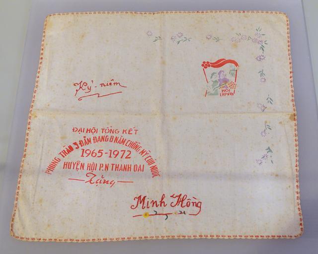 Keywords: Handkerchief given to Hoang Thi Hong at the conference for the evaluation of the Three Responsibilities movement, Ha Tay, 1972 - Vietnamese Women's Museum - Hanoi, Vietnam - DSC04218.JPG en Exhibit in the Vietnamese Women's Museum Hanoi Vietnam Photography was permitted in the museum without restriction 2014-08-04 04 00 58 own Daderot other versions cc-zero Wartime items in the Vietnamese Women's Museum Uploaded with UploadWizard Handkerchiefs