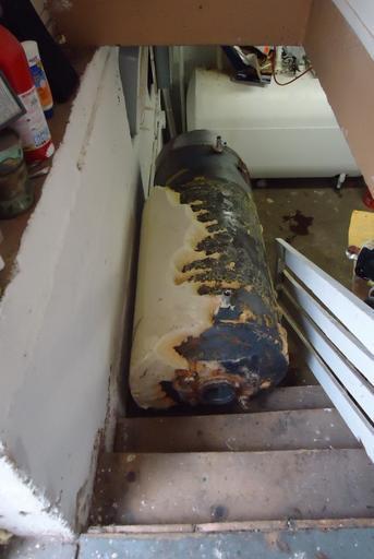 | Keywords: Handyman project to disassemble hot water heater 23.JPG en View from the top of the basement stairs looking down at a 200 pound slimmed-down hot water heater Photo from a project to remove a bulky heavy non-needed 75 gallon hot water heater from a basement 2013-02-25 22 34 13 own Tomwsulcer cc-zero Uploaded with UploadWizard Water heating devices Handyman photos by tom sulcer Stairs | ||||