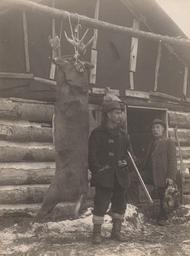 Keywords: animals buildings hunting monochrome outdoor Photographer: Reuben R. Sallows (1855 - 1937) Description: Two men standing in front of log building beside a hanging white tailed buck; man on left, holds rifle, wears dark hat, winter jacket, pants, high laced boots with top of socks showing; older man on right stands in doorway holding dead bird; date (1911/108) in pencil and Sallows stamp in blue ink on back Object ID : 0417-rrs-ogohc-ph View additional photographs by Sallows that are held in other collections at the Reuben R. Sallows Digital Library. Order a higher-quality version of this item by contacting the Huron County Museum (fee applies). Photographer: Reuben R. Sallows (1855 - 1937) Description: Two men standing in front of log building beside a hanging white tailed buck; man on left, holds rifle, wears dark hat, winter jacket, pants, high laced boots with top of socks showing; older man on right stands in doorway holding dead bird; date (1911/108) in pencil and Sallows stamp in blue ink on back Object ID : 0417-rrs-ogohc-ph View additional photographs by Sallows that are held in other collections at the Reuben R. Sallows Digital Library. Order a higher-quality version of this item by contacting the Huron County Museum (fee applies). |