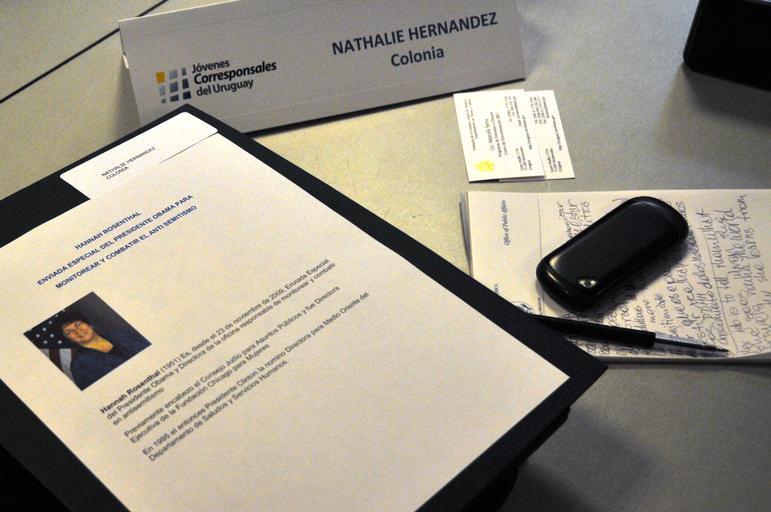 | Keywords: rosenthal anti-semitism antisemitism discrimination religion human rights humanrights indoor text writing document Photo: Rosenthal's introductory bio is among a Youth Correspondents Program participant's items during a program seminar in Montevideo. Special Envoy to Monitor and Combat Anti-Semitism, Hannah Rosenthal, visited Uruguay December 3-6 to attend the B'nai B'rith Conference in Montevideo. During her visit she also met with members of the Uruguay Ministry of Foreign Affairs Human Rights Bureau, society groups, and interfaith religious leaders. While in Montevideo, Rosenthal visited the Yavne School and the Holocaust Memorial. On Dec. 5, Rosenthal spoke to a group of Youth Correspondents Program participants on "Promoting Anti-Discrimination through Blogging." [U.S. Embassy photo by Pablo Castro / Copyright info] Photo: Rosenthal's introductory bio is among a Youth Correspondents Program participant's items during a program seminar in Montevideo. Special Envoy to Monitor and Combat Anti-Semitism, Hannah Rosenthal, visited Uruguay December 3-6 to attend the B'nai B'rith Conference in Montevideo. During her visit she also met with members of the Uruguay Ministry of Foreign Affairs Human Rights Bureau, society groups, and interfaith religious leaders. While in Montevideo, Rosenthal visited the Yavne School and the Holocaust Memorial. On Dec. 5, Rosenthal spoke to a group of Youth Correspondents Program participants on "Promoting Anti-Discrimination through Blogging." [U.S. Embassy photo by Pablo Castro / Copyright info] |