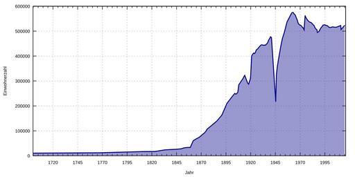 | Keywords: Hannover population.svg en Hannover population statistics since 1700 de Einwohnerentwicklung von Hannover seit 1700 own ; data from de Einwohnerentwicklung_von_Hannover Gorgo 2011-03-06 Gnuplot script to generate this plot gnuplot <source lang gnuplot > /usr/bin/gnuplot gnuplot 4 2 / Ubuntu 8 10 input set timefmt d m Y set datafile separator ; output unset key set style data lines set style fill transparent solid 0 4 set grid set xdata time set xlabel 'Jahr' set xrange '01 01 1700' '31 12 2010' set xtics 788400000 set mxtics 5 set format x ' Y' set ylabel 'Einwohnerzahl' set ytics 100000 set format y ' 0f' set term svg size 800 400 font Arial 10 set output 'hannover_population svg' plot '-' using 1 2 with filledcurves below x1 lt rgb 'dark-blue' lw 2 30 06 1190;1500 30 06 1350;4000 30 06 1435;5000 30 06 1766;11874 30 06 1811;16816 30 06 1823;17199 30 06 1833;23761 03 12 1843;25916 03 12 1846;26896 03 12 1849;28030 03 12 1852;31876 03 12 1855;33148 03 12 1858;33467 03 12 1861;60120 03 12 1864;67815 03 12 1867;73952 01 12 1871;87626 31 12 1872;90404 31 12 1873;95167 31 12 1874;99930 01 12 1875;106677 01 12 1880;122843 01 12 1885;139731 01 12 1890;163593 02 12 1895;209535 01 12 1900;235666 31 12 1901;240962 31 12 1902;245901 31 12 1903;250408 31 12 1904;247059 01 12 1905;250032 31 12 1906;254261 31 12 1907;284849 31 12 1908;290858 31 12 1909;296867 01 12 1910;302375 31 12 1911;308300 31 12 1912;316292 31 12 1913;322432 01 12 1916;292165 05 12 1917;287072 08 10 1919;310431 31 12 1919;321200 31 12 1920;400300 31 12 1921;407400 31 12 1922;412100 31 12 1923;410000 31 12 1924;416600 16 06 1925;422745 31 12 1925;426200 31 12 1926;428300 31 12 1927;433500 31 12 1928;438000 31 12 1929;443000 31 12 1930;445200 31 12 1931;444700 31 12 1932;443100 16 06 1933;443920 31 12 1933;444184 31 12 1934;444130 31 12 1935;448157 31 12 1936;452251 31 12 1937;462214 31 12 1938;470100 17 05 1939;470950 31 12 1939;477100 31 12 1940;474800 30 04 1945;217000 31 12 1945;325841 29 10 1946;354955 31 12 1947;384240 13 09 1950;444296 31 12 1951;469300 31 12 1952;482253 31 12 1953;495130 25 09 1956;536810 06 06 1961;572917 31 12 1961;574481 31 12 1962;574754 31 12 1963;568766 31 12 1964;565104 31 12 1965;555228 31 12 1966;545468 31 12 1967;531706 31 12 1968;526975 31 12 1969;523874 27 05 1970;523941 31 12 1970;522098 31 12 1971;516744 31 12 1972;513480 31 12 1973;505106 31 12 1974;562951 31 12 1975;552955 31 12 1976;547077 31 12 1977;542134 31 12 1978;538243 31 12 1979;535854 31 12 1980;534623 31 12 1981;531319 31 12 1982;526253 31 12 1983;523033 31 12 1984;514010 31 12 1985;508298 31 12 1986;505718 25 05 1987;494864 31 12 1987;495867 31 12 1988;498495 31 12 1989;505872 31 12 1990;513010 31 12 1991;517476 31 12 1992;523627 31 12 1993;524823 31 12 1994;525763 31 12 1995;523147 31 12 1996;522574 31 12 1997;520670 31 12 1998;516157 31 12 1999;514718 31 12 2000;515001 31 12 2001;516415 31 12 2002;517310 31 12 2003;516160 31 12 2004;515841 31 12 2005;515729 31 12 2006;516343 31 12 2007;518069 31 12 2008;519619 31 12 2009;520966 30 06 2010;520936 e </source> Cc-zero Temporal population graphs of Lower Saxony Hanover History of Hannover Images with Gnuplot source code |