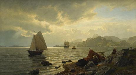 | Keywords: Hans Gude - Motivet hämtat från Spinnkusten längs Sörlandskusten (1872).jpg Artwork Creator Hans Gude 1872 oil canvas cm 83 148 object history Såld hos Lempetz i Köln 1928; - Såld hos Paffrath i Dusseldorf omkring 1970; - Tidigare i samling W Lourdan Berlin och i Heingalerie credit line H F Gude 1872 ~ lower right signature and date accession number http //auktionsverket se/auction/fine-arts/2012-06-12/1953-hans-gude-norsk-kust/ Stockholms Auktionsverk 2012 06 lot 1953 PD-old-100 Paintings by Hans Gude Landscape paintings of Norway 1870s landscape paintings Oil paintings of seascapes Paintings of sailboats 19th-century sailing ships in paintings 1872 paintings Images from Stockholms Auktionsverket 19th-century paintings location missing |