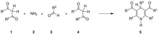 Keywords: Hantzsch Dihydropyridin Reaktion v2 Überblick.svg en Hantzsch-Dihydropyridine-Synthesis de Hantzsche-Dihydropyridin-Synthese own Ð”Ñ‘Ñ Ñ‚Ðµ Вилкен 2012-06-06 Hantzsch dihydropyridine synthesis Cc-zero