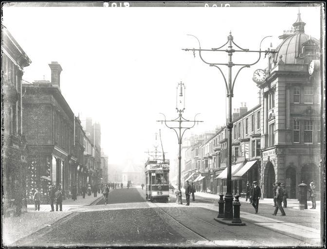| Keywords: hartlepool west hartlepool westhartlepool church street churchstreet historic victorian tram electric tram electrictram church black and white blackandwhite b&w bw buildings people old west hartlepool historic street views westhartlepoolhistoricstreetviews road outdoor blackandwhite architecture black and white Photograph of Church Street, West Hartlepool, looking up the street towards Christ Church showing the shops and buildings on either side of the street. The photo also shows an electric tram on the tramline which was opened in 1885. This photograph dates approximately between 1885 to 1905 Photograph was taken from a glass plate negative. Photograph of Church Street, West Hartlepool, looking up the street towards Christ Church showing the shops and buildings on either side of the street. The photo also shows an electric tram on the tramline which was opened in 1885. This photograph dates approximately between 1885 to 1905 Photograph was taken from a glass plate negative. |