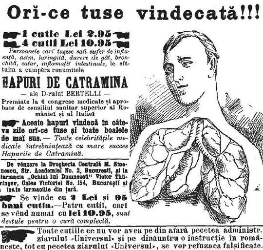 Keywords: Hapuri de catramina (Universul ad).JPG ro Orĭ-ce tuse vindecată 1 cutie Lei 2 95 4 cutii Lei 10 95 Persoanele carí tuşesc saŭ sufer de influenţă astm laringită durere de gât bronchită catar inflamaţii intestinale le sfătuim a cumpĕra renumitele HAPURI DE CATRAMINĂ ale D-ruluĭ BERTELLI Premiate la 6 congrese medicale şi aprobate de consiliul sanitar superior al României şi Italiei Aceste hapurĭ vindecă în câte-va zile orĭ-ce tuse şi toate boalele de maĭ sus Toate celebrităţile medicale întrebuinţează cu mare succes Hapurile de Catramină De vênzare la Drogheria Centrală M Stoenescu Str Academieĭ No 2 Bucureştĭ şi la farmacia Ochiul lui Dumnezeŭ Victor Thūringer Calea Victoriei No 154 Bucureştĭ şi la toate farmaciile din ţară Se vinde cu 2 Leǐ şi 95 banĭ cutia Patru cutii carǐ se se vênd numai cu Leǐ 10 95 sunt destule pentru o cură complectă Toate cutiile ce nu vor avea pe din afară pecetea administr ziaruluĭ Universul şi pe dinăuntru o instrucţie în româneşte tot cu pecetea ziaruluĭ Universul se vor refuza ca falşificate <br>Meaning <br> Any cough cured 1 box 2 95 Lei 4 boxes 10 95 Lei We advise persons with a cough or who suffer from influenza asthma laryngitis sore throat catarrh inflammation of the bowels to buy the famous CREOSOTE PILLS of Dr BERTELLI Awarded prizes at 6 medical congresses and approved by the Superior Sanitary Councils of Romania and Italy These pills will cure any cough and any of the aforementioned diseases in a matter of days All medical celebrities are successfully working with Creosote Pills Available at the M Stoenescu Central Drugstore Academieĭ Street 2 Bucharest and at the Eye of God Victor Thūringer Pharmacy Calea Victoriei 154 Bucharest and through all pharmacies in the country Sells for 2 Lei and 95 Bani a box Four boxes selling for 10 95 Lei suffice for a complete recovery All boxes not stamped on the outside with the seal of Universul newspaper offices and not featuring a Romanian guide on the inside that should also bear the Universul seal are to be returned as forgeries http //dspace bcucluj ro/bitstream/123456789/18083/1/BCUCLUJ_FP_P3441_1895_013_0035 pdf Universul Literar 35/1895 unknown/uncredited August 1895 Universul Pharmacies in Romania Advertisements in the Kingdom of Romania Diseases and disorders in Romania 1895 advertisements 1895 in Bucharest 1895 in medicine Magazine ads Medicine advertising Coupons Creosote Calea Victoriei Bucharest PD-old |