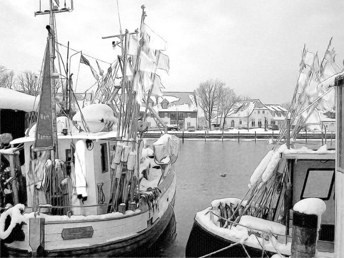 Keywords: harbor boats winter frozen snowclad snow snowfall vessel transport harbour
