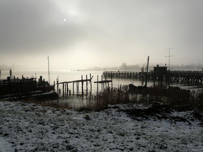 Keywords: harbour port river winter fog mist black and white crane snow pontoon jetty