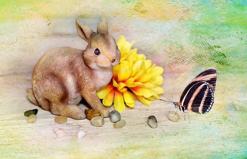 Keywords: hare easter bunny dekohase dekoblume flower yellow blossom bloom stones butterfly deco decorative decoration painting digital painting spring easter