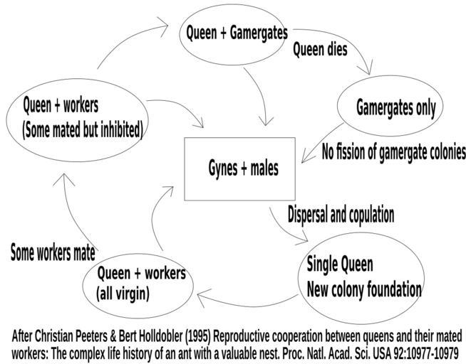 | Keywords: HarpegnathosLifeCycle.svg  Life cycle of Harpegnathos saltator own work based on Christian Peeters Bert Holldobler 1995 Reproductive cooperation between queens and their mated workers The complex life history of an ant with a valuable nest Proc Natl Acad Sci USA 92 10977-10979 http //www pnas org/cgi/reprint/92/24/10977 pdf 2008-04 L Shyamal pd Harpegnathos saltator |