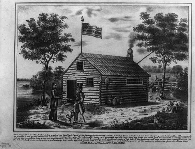 Keywords: Harrison at cabin on North Bend of Ohio - 1840 lithograph.jpg from Library of Congress A Whig Party United States Whig campaign print showing William Henry Harrison greeting a wounded veteran before a log cabin by a river The cabin flies an American flag with the words Harrison Tyler and with a liberty cap on its staff A coonskin is tacked to the side of the cabin two barrels of hard cider stand by and a farmer ploughs a field in the distance The text below the image describes the scene This Log Cabin was the first building erected on the North Bend of the beautiful Ohio River with the barrel of cider outside and the door always open to the traveller The wounded soldier is one of Gen Harrison's comrades meeting him after his celebrated Battle of Tippecanoe Victory of Tippecanoe and not only does the brave old Hero give his comrade a hearty welcome but his dog recognizes him as an old acquaintance and repeats the welcome by a cordial and significant shake of his tail If the looker-on will only watch close enough he can see the tail absolutely shake in the picture particularly on a clear day and if it is held due East and West so as to feel the power of the magnetic attraction from the Great West The closing statement is a reference to Harrison's broad base of support in the western United States LOC-image cph 3a08856 Thomas Sinclair lithograph Philadelphia 1840 PD-old-100 Houses in Hamilton County Ohio William Henry Harrison United States presidential election 1840 Thomas S Sinclair North Bend Ohio |