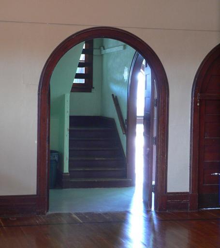 Keywords: Hartington auditorium basketball court SW door.JPG Hartington Nebraska southernmost of four doors on west side of basketball court The stairs visible through the doorway make a 180-degree turn and continue upward to end at a blank wall The upper portion of the stairway can be seen at File Hartington auditorium SW stairs up JPG The bright light at the right edge of the doorway comes from the west entrance of the building own Ammodramus 2010-11-01 Pictures by Ammodramus Taken with Panasonic Lumix DMC-FZ20 Hartington Nebraska city auditorium |