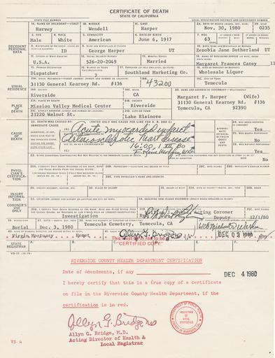 Keywords: Harvey Sr. death certificate brendaharper