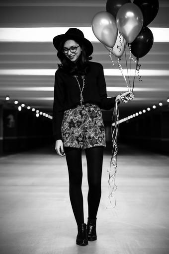 Keywords: hat black hat balloons black and white parking fashion beauty girl with helium balloons portrait glasses smile