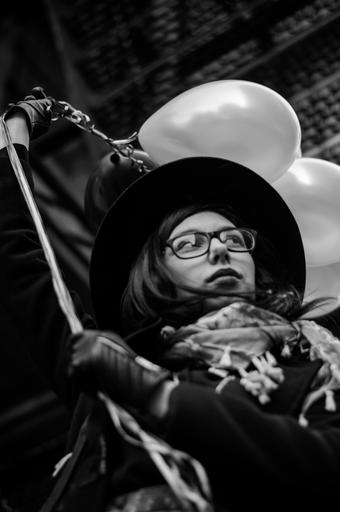 Keywords: hat girl portrait innocence beauty black and white bucharest street balloons helium balloons scale composition gloves black hat black gloves glasses woman