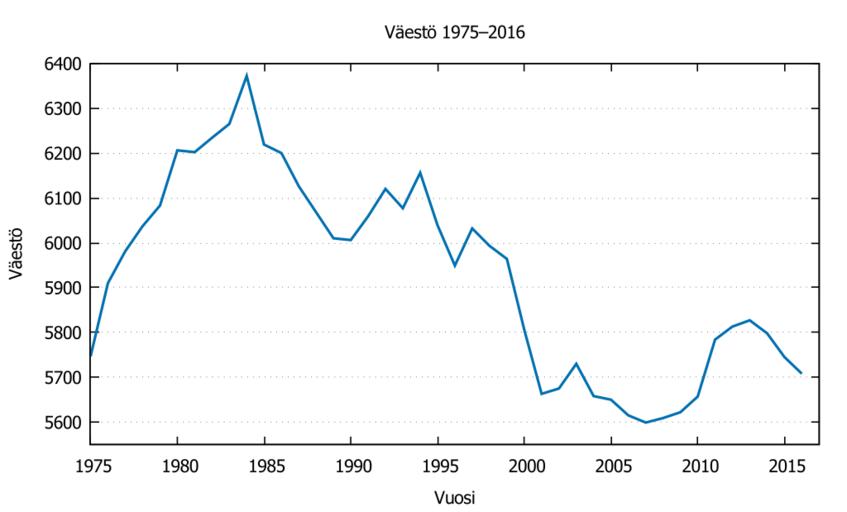 Keywords: Haukilahti population.svg fi Haukilahden väestö kuvaajan tiedot http //www aluesarjat fi/ bmark /DATABASE/ALUESARJAT_KAUPUNKIVERKKO/VAESTO_SAL/VAKILUKU_SAL/B02S_ESP_Vakiluku1975 lang FI qr Alue 049 ;232 ;Haukilahti 22Ik 228; V 228;est 246; ;yhteens 228; 22Vuosi 1975;1976;1977;1978;1979;1980;1981;1982;1983;1984;1985;1986;1987;1988;1989;1990;1991;1992;1993;1994;1995;1996;1997;1998;1999;2000;2001;2002;2003;2004;2005;2006;2007;2008;2009;2010;2011;2012;2013;2014;2015;2016 case db aluesarjoista Created with Gnuplot 2016-05-18 own Markus Säynevirta other versions thumb left 150px Outdated PNG version Data <pre> Year Population 1975 5747 1976 5910 1977 5981 1978 6037 1979 6083 1980 6206 1981 6202 1982 6234 1983 6265 1984 6372 1985 6219 1986 6200 1987 6126 1988 6068 1989 6010 1990 6006 1991 6059 1992 6120 1993 6077 1994 6156 1995 6039 1996 5949 1997 6032 1998 5993 1999 5964 2000 5806 2001 5663 2002 5675 2003 5730 2004 5658 2005 5650 2006 5615 2007 5599 2008 5609 2009 5622 2010 5657 2011 5784 2012 5813 2013 5827 2014 5798 2015 5745 2016 5708 </pre> Haukilahti SVG diagrams Gnuplot diagrams |