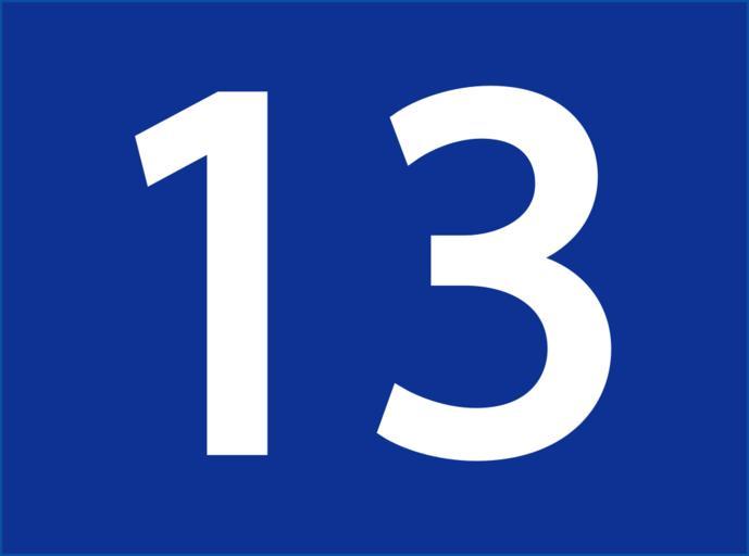 | Keywords: Hauptstrasse 13 number.svg Schweizer Hauptstrassennummer Automatisch erzeugt durch Felix Portier Swiss Cantonal Road Hauptstrassen number signet Created automatically by Felix Portier 2008-09-13 own assumed Felix Portier~commonswiki Hauptstrassen numbers 13 13 number Blue and white signs Blue rectangles Rectangles with numbers |