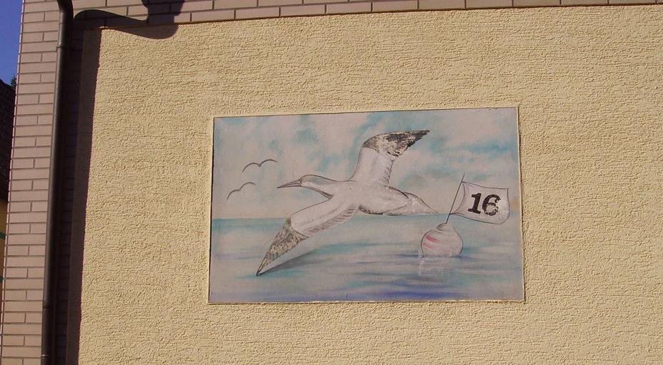 Keywords: Haus Nr 16.JPG en House number in Germany Own Immanuel Giel 2008 Birds in art Artistic house numbers in Germany 016 Paintings of seascapes 16 house number