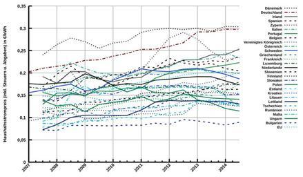 | Keywords: Haushaltsstrompreise in der EU inkl Steuern und Abgaben.svg de Haushaltsstrompreise in der EU inkl Steuern und Abgaben nach Eurostat http //appsso eurostat ec europa eu/nui/show do wai true dataset nrg_pc_204 2015-05-04 own StefanPohl other versions v reset set decimalsign ' ' set term svg size 1200 700 fname 'Arial bold' fsize 17 lw 4 set grid lt 1 lc rgb 0xAAAAAA lw 5 set border 3 set key outside right maxcols 1 font 'Arial bold 14' spacing 8 width -8 set timefmt ' Y m' set format x ' Y' set xdata time set tics nomirror set xtics rotate by 45 right set yrange 0 set autoscale xfix set ylabel 'Haushaltsstrompreis inkl Steuern u Abgaben in ‚¬/kWh' set output 'strom svg' plot for i 2 31 'strom txt' u 1 i title columnhead i w l lw 75 dt i 4+1 lc rgb 2 24/ i-1 unset output cc-zero Uploaded with UploadWizard Electricity prices in the European Union |