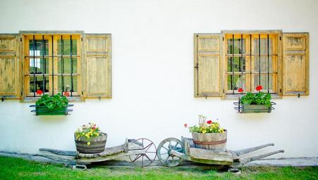 Keywords: hauswand lattice windows running karre wooden barrow wheelbarrow flowerpot flower box window wall shutter wood shop facade romantic architecture home building housewife idyllic historically decorative