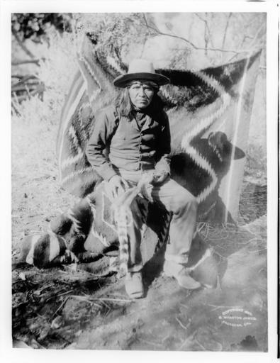 | Keywords: Havasupai Indian man, Manakacha, "Kohot" or chief, ca.1899 (CHS-3771).jpg en <br> Havasupai Indian man Manakacha Kohot or chief ca 1899 Photograph of a Havasupai Indian man Manakacha Kohot or chief ca 1899 He wears a hat with a wide brim a cloth tied about his forehead and a vest over a shirt with trousers and shoes He has dark shoulder-length hair He is sitting on a stool or chair outside turned slightly to his left His head and gaze face the camera directly In his left hand and draped over his right thigh he holds a long furry striped animal tail of a raccoon Behind him hangs a blanket with a bold zig-zag pattern Vegetation is visible in the background Call number CHS-3771 Photographer James George Wharton Filename CHS-3771 Coverage date circa 1899 Part of collection California Historical Society Collection 1860-1960 Type images Part of subcollection Title Insurance and Trust and C C Pierce Photography Collection 1860-1960 Repository name USC Libraries Special Collections Format glass plate negatives Microfiche number 1-167- Archival file chs_Volume95/CHS-3771 tiff Repository address Doheny Memorial Library Los Angeles CA 90089-0189 Geographic subject country USA Format aacr2 2 photographs glass photonegative photoprint b w ; 22 x 17 cm Rights Digitally reproduced by the USC Digital Library; From the California Historical Society Collection at the University of Southern California Subject adlf tribal areas Project USC Accession number 3771 Repository email specol usc edu Contributing entity California Historical Society Date created circa 1899 Publisher of the digital version University of Southern California Libraries Format aat photographic prints; photographs Legacy record ID chs-m16356; USC-1-1-1-13517 Access conditions Send requests to address or e-mail given Phone 213 821-2366; fax 213 740-2343 Subject file heading Indians -- Havasupai Subject lcsh Indians of North America; Havasupai Indians; Men; Civic leaders; Clothing and dress Subject Havasupai Indians circa 1899 date created James George Wharton http //digitallibrary usc edu/cdm/ref/collection/p15799coll65/id/16295 PD-old-70-1923 Images from USC Digital Library uploaded by Fæ California Historical Society Collection 1860-1960 Glass plate negatives Havasupai Photographs by George Wharton James |